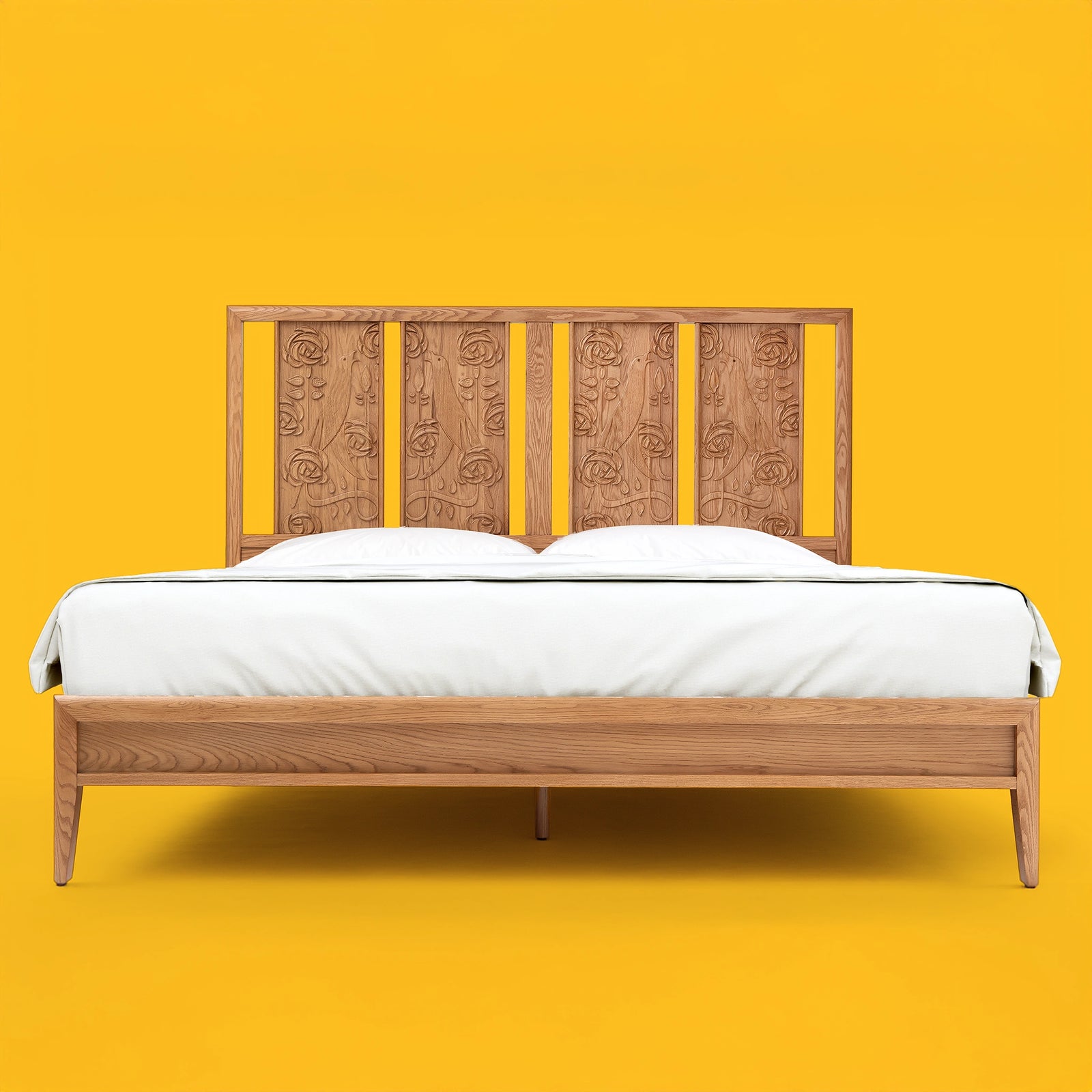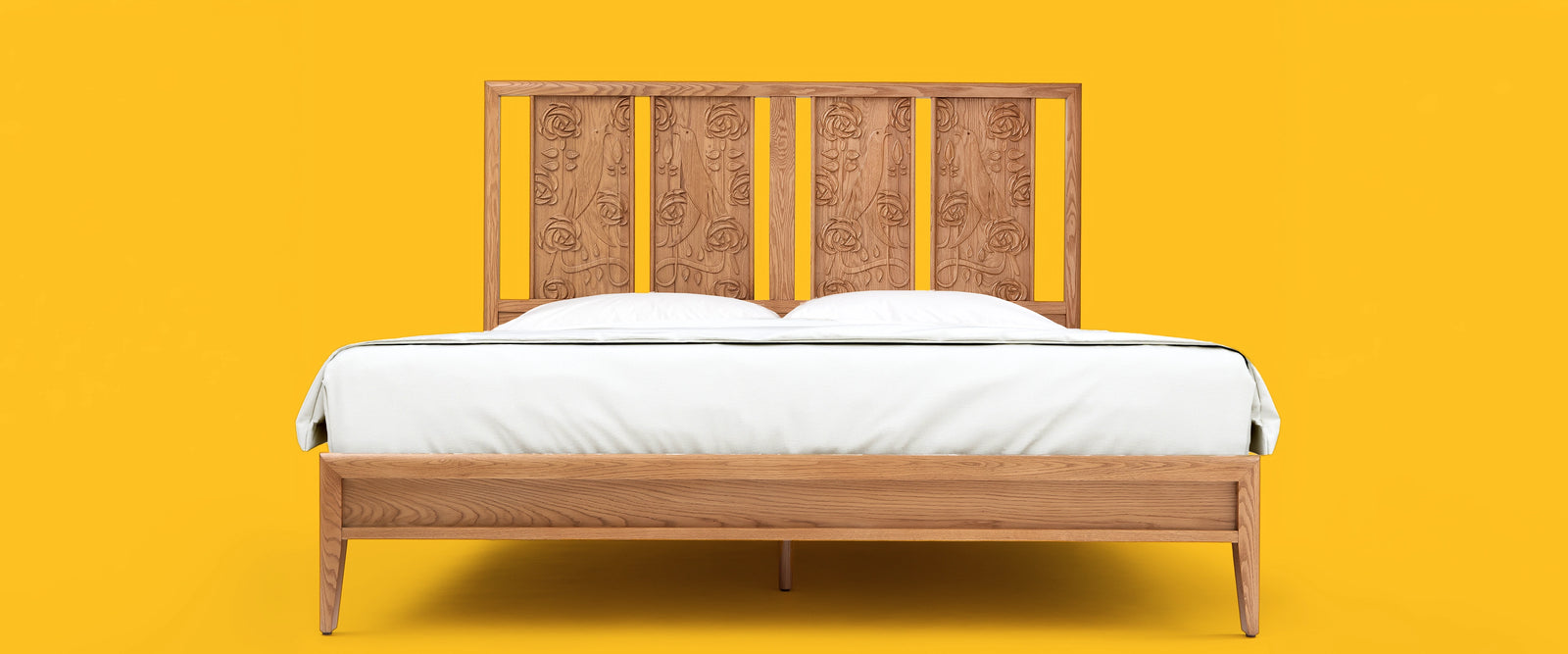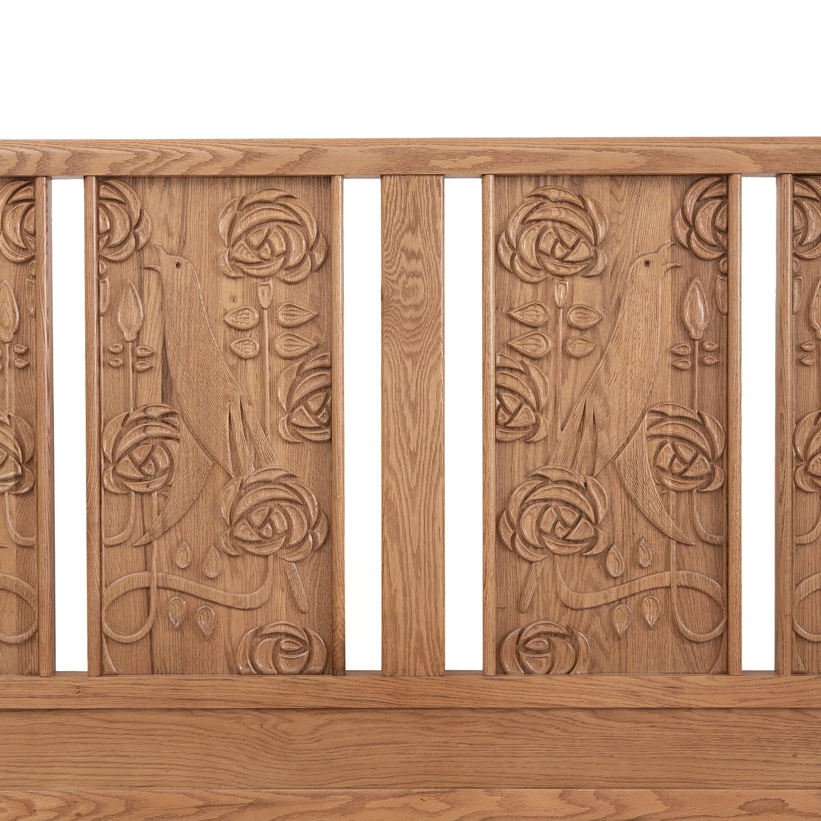 Offered in a low footboard design, the Paloma Bed features a taller headboard to showcase its sculpted panels of doves and foliage. Rooted in the modernist movements of the 1930s, it blends minimalist form with decorative detail—drawing from the overlapping influences of Art Deco, Art Nouveau, and the Arts and Crafts tradition.