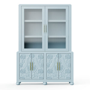 Above, a tall hutch framed in solid oak is fitted with tempered reeded glass panels, obscuring the contents while casting gentle rhythms of light and shadow. It is a cabinet designed to function beautifully in a kitchen, bedroom, study, hallway, or living room, offering generous storage behind both doors and display.